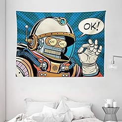 Ambesonne Modern Tapestry, Futuristic Comics Super Heros Like Robot in a Spacesuit with OK Words Artwork Print, Wide…