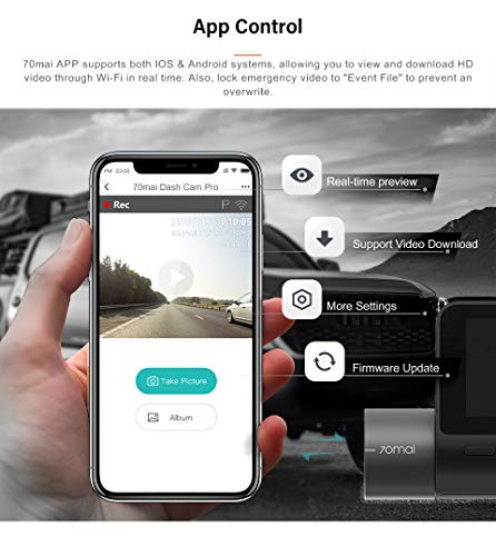 ?【MOBILE APP ENABLED & VOICE CONTROL】Connect to the official 70mai mobile app via Wi-Fi to operate your 70mai Smart Dash Cam Pro directly on your phone. Watch live streaming view, replay or download recorded footage whenever and wherever you want them. Simply give voice commands to your 70mai Smart Dash Cam Pro to finish your photo/video taking tasks and more, all hands-free. 70mai official mobile app supports iOS 8.0 & Android 4.4 and above
