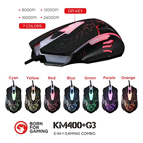 Gaming Keyboard, Mouse and Mouse Pad Combo:114 keys USB wired backlit keyboard with 10 multimedia keys, simple to function , anti ghosting 19 keys roll over help and three colours backlighting keyboards;7 colours LED respiratory lights symmetrical gaming mouse; Massive environmental safety material, easy floor with out been fold ,odorless mouse mat