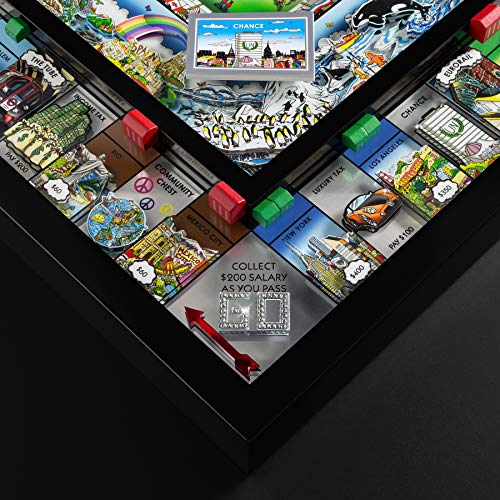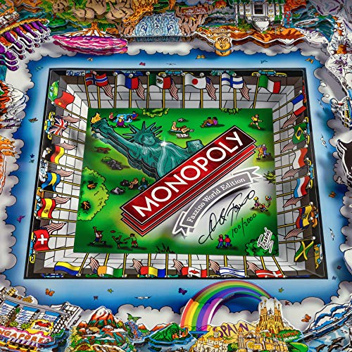 The most iconic cities in the world sparkle with the unique three-dimensional artwork of Charles Fazzino in this follow-up to the sold out Monopoly Fazzino New York City Edition. Gather your family and friends around this limited edition work of art, select a custom-designed diecast token, and attempt to own it all – across the globe! Each of the 2,000 units is signed and numbered by Charles Fazzino before being carefully adorned with crystals, layered inside a black solid wood frame, and topped with tempered glass. The premium game components include six Fazzino-designed diecast metal Monopoly tokens, as well as custom Title Deeds, Chance and Community Chest cards, and money, all stored neatly inside the parts box. Packaged in a stunning silver-foil box, this makes a perfect gift – for yourself or for someone else!