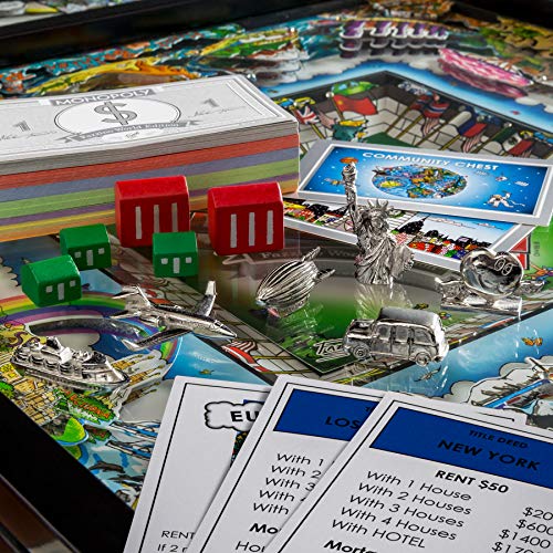 Includes exclusive Monopoly Title Deeds, Chance and Community Chest cards, and money designed by Charles Fazzino, as well as painted wood houses and hotels.
